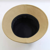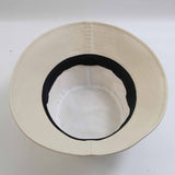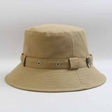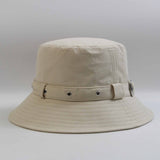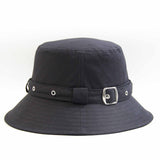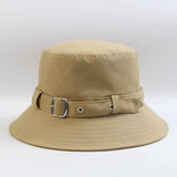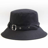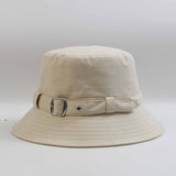 Classic cotton bucket hat featuring a buckle band for embellishment. Flat crown and full, stitched brim.