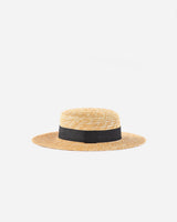 Simple straw hat for sunny days. Made of woven wheat straw in natural colors, with a flat crown, full brim and wraparound ribbon.